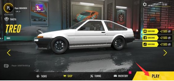 1、进入游戏首页后直接点击开始按钮,系统会加载出车库界面和赛事看板。这时能看到当前可参与的各项赛事活动与基础教学指引。