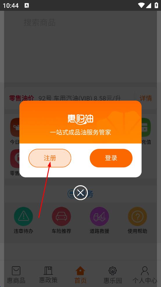 1、打开惠购油软件,在弹出的注册登录选择窗口中,点击“注册”选项,进入选择注册方式页面。