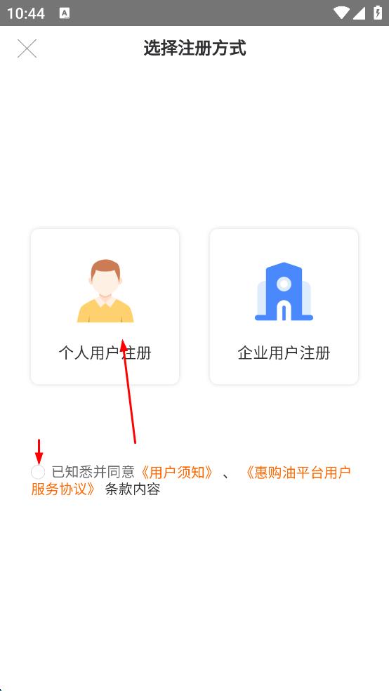 2、在选择注册方式页面,勾选“已知悉并同意用户须知、惠购油平台用户服务协议条款内容”,然后点击“个人用户注册”。