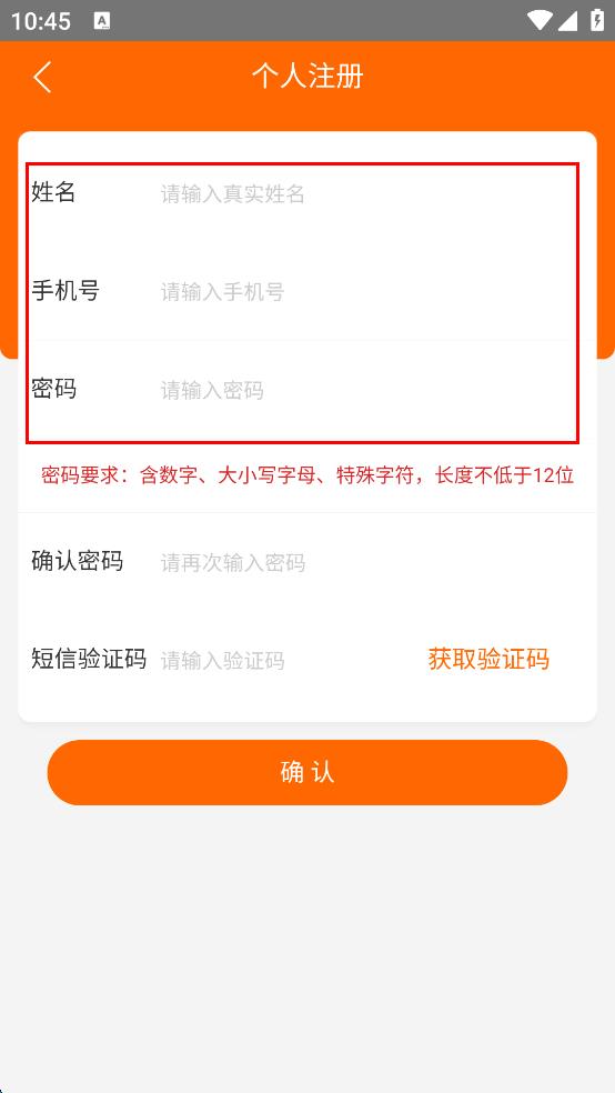 3、进入个人注册页面后,依次输入真实姓名、手机号码以及符合要求的密码。