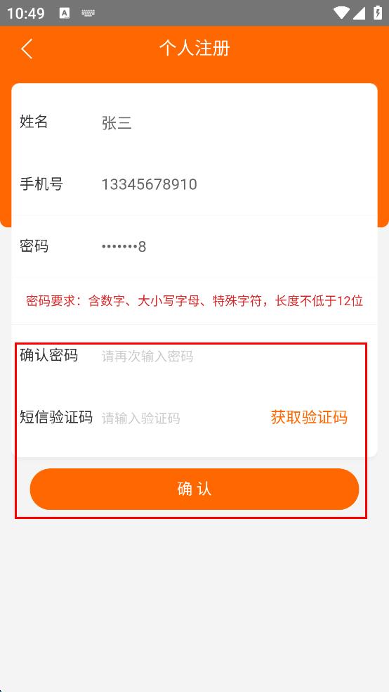 4、再次输入密码进行确认,点击“获取验证码”,输入收到的短信验证码后,点击“确认”按钮,即可完成个人用户注册操作。