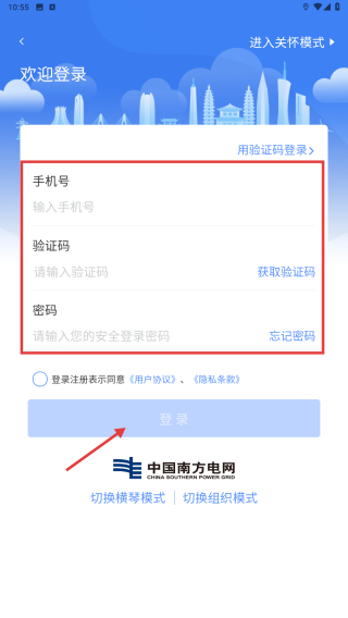 4、输入手机号、验证码和密码,勾选协议后点击登录按钮,完成账号登录。