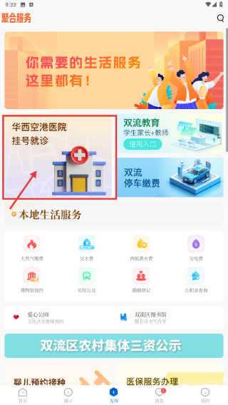 2、打开政务服务类应用,点击华西空港区医院挂号就诊入口,进入预约挂号页面。