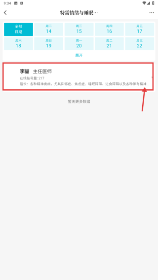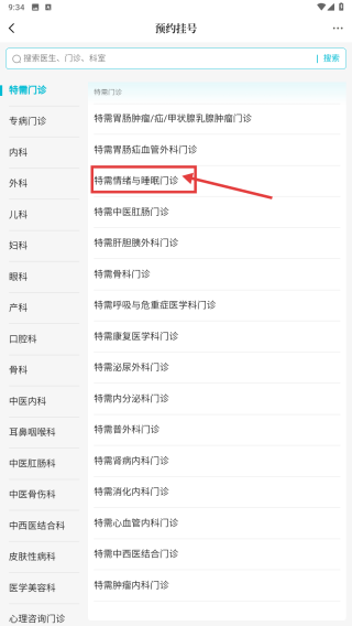 3、在预约挂号页面,选择特需情绪与睡眠门诊分类,进入门诊详情页。