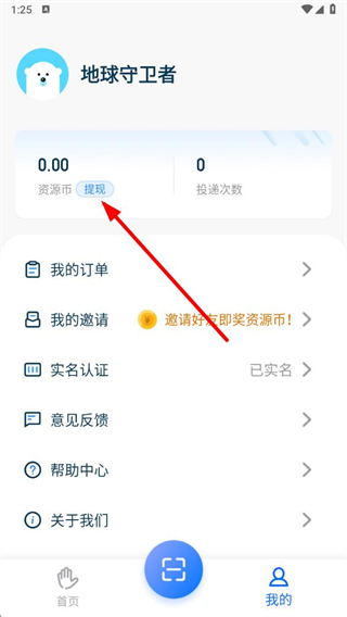 2、在我的页面,找到资源币数额旁的提现按钮并点击。