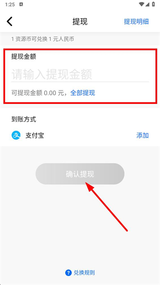 4、在提现页面,输入提现金额,到账方式为支付宝,也可添加其他方式,点击确认提现即可。