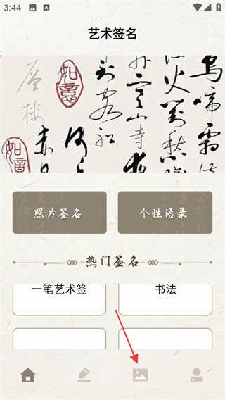 1、进入艺术签名页面,点击底部图片图标,进入艺术壁纸页面。