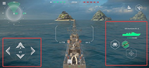 3、通过左手在触屏上滑动来控制舰船航行方向,右手点击火炮按键对锁定目标实施精准打击。