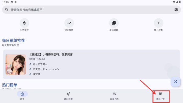 1、打开音乐应用,点击底部音乐分类选项,进入音乐分类页面。