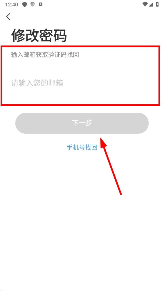 5、在修改密码页面,输入邮箱获取验证码,也可选择手机号找回,填写完信息后点击下一步,按照后续提示完成密码修改操作。