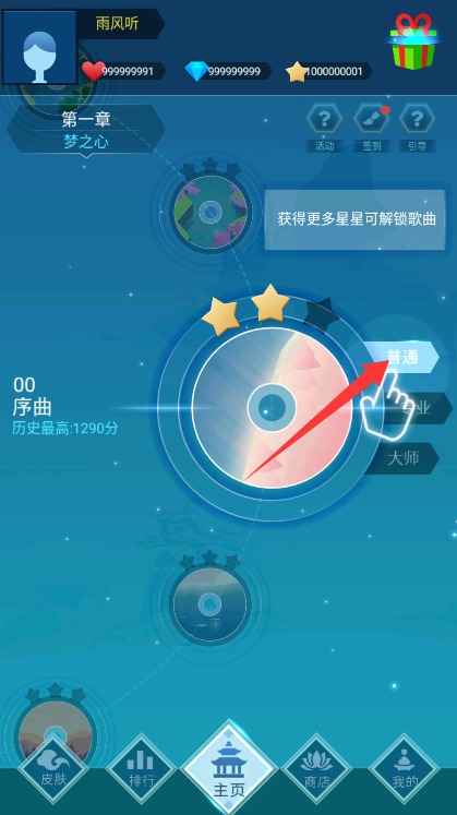 经典模式,玩家在游戏中可以伴随音乐节奏敲击下落的音符,或通过滑动的方式连击连续的旋律音符以获得畅快的游戏体验。