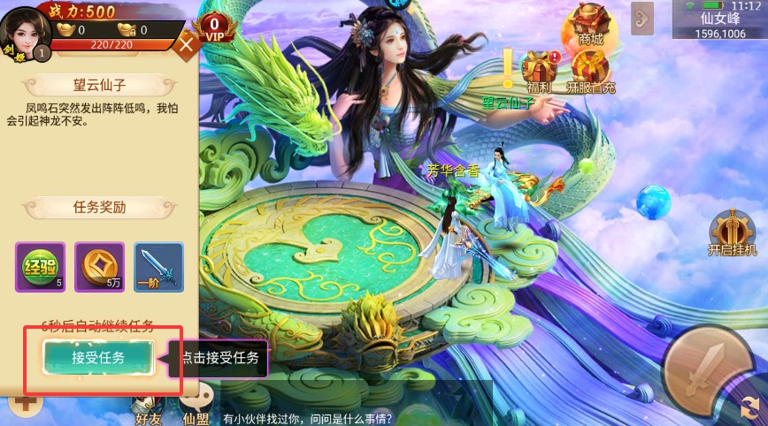4、根据系统的新手引导点击接受任务按钮,逐步了解游戏核心玩法与战斗系统。