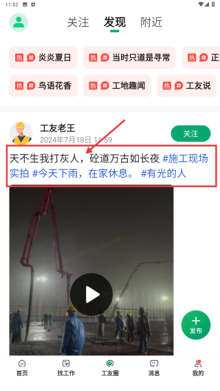 2、在工友圈页面,点击发现标签,查看推荐的工友动态内容。