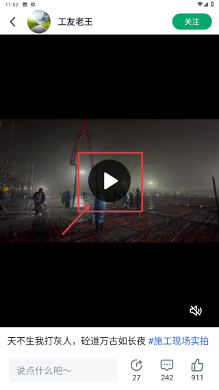 4、在帖子详情页,点击视频播放按钮,观看施工现场实拍视频。