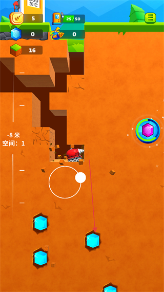 1、进入游戏,查看屏幕上方资源数值,操控钻头挖掘地下方块。