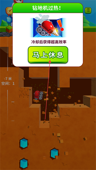 4、若出现钻地机过热!提示,点击马上休息让钻机冷却。
