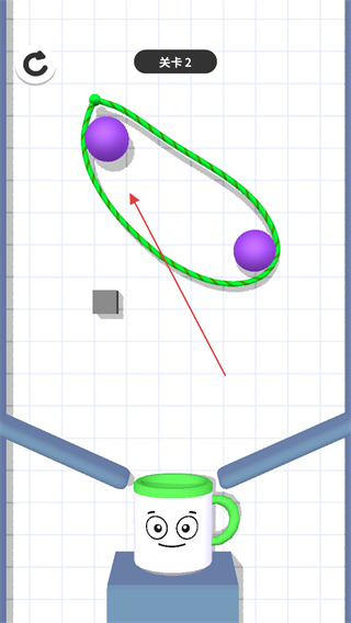 1、进入关卡2,观察杯子上方紫色球体位置及周边环境。