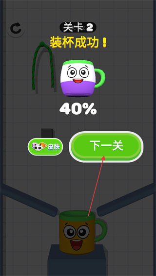 4、成功装杯后,当显示装杯进度如40%达标,点击下一关进入新关卡。