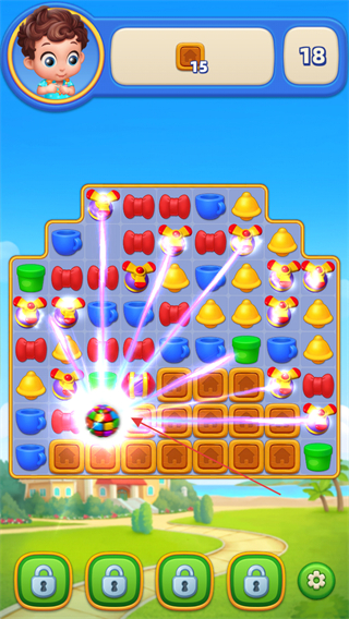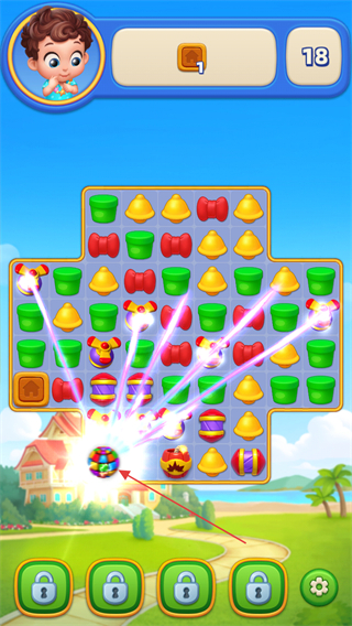 3、当凑齐特殊道具如彩色球道具时,点击或让其与其他道具组合,释放强大消除特效,清除大片区域。