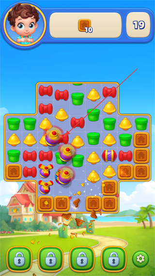 2、观察消除界面,通过移动道具位置,使三个或三个以上相同道具连成一线,触发消除效果。