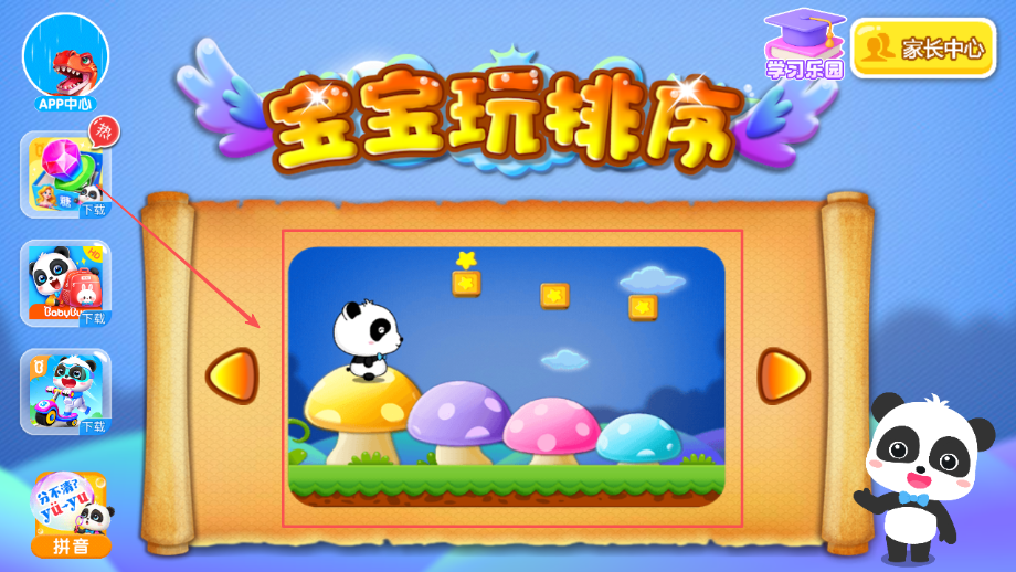 宝宝玩排序是宝宝巴士推出的益智启蒙游戏,通过可爱的小熊猫带领孩子学习排序知识。游戏包含丰富有趣的排序挑战,帮助孩子在冒险中掌握大小、高低等概念。多种互动小游戏让学习过程充满乐趣,快来和孩子一起探索这个奇妙世界吧。