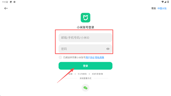 4、在密码登录界面,输入邮箱/手机号码/小米ID和密码,点击登录按钮,完成账号登录操作。