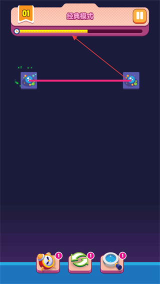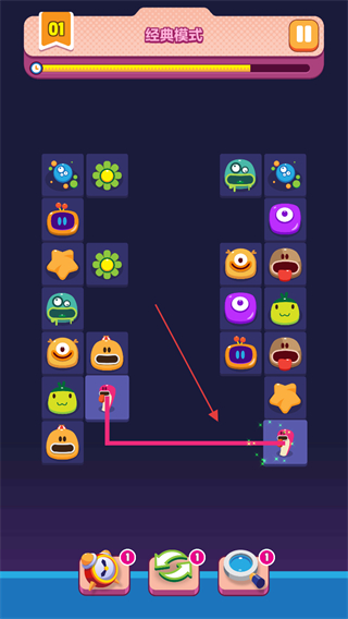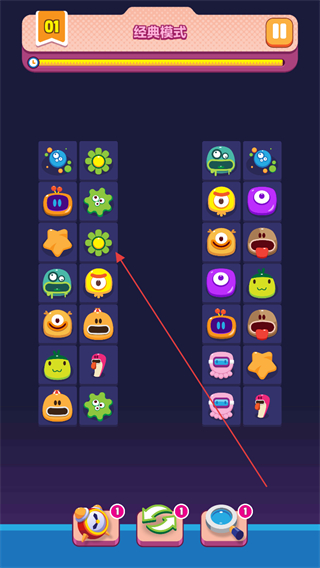 1、进入游戏,选择经典模式,查看关卡进度如01,在界面中找到两个相同的图案。