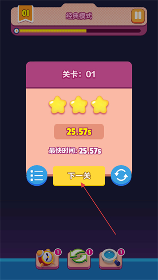 4、在规定时间内消除所有图案后,根据用时获得星级评价,点击下一关按钮进入下一关挑战。