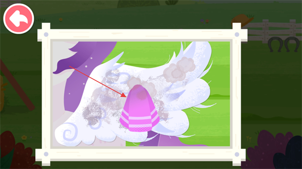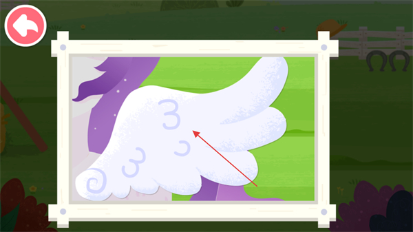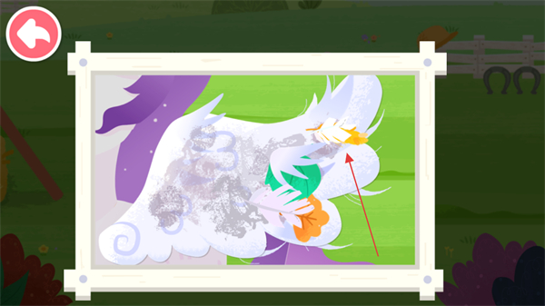 1、进入小马绘画修复关卡,观察带有污渍的小马翅膀画作,找到需要修复的部位。