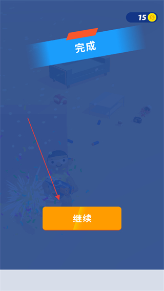 4、成功击败敌人后,出现完成提示,点击继续按钮,进入下一个关卡。