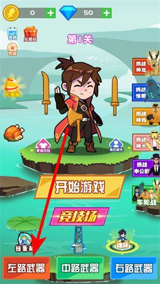 2、进入游戏后,可点击开始游戏,在关卡中,依据提示点击下方武器按钮,使用对应武器攻击对手,不同武器有不同攻击效果与耗蓝,需合理选择。