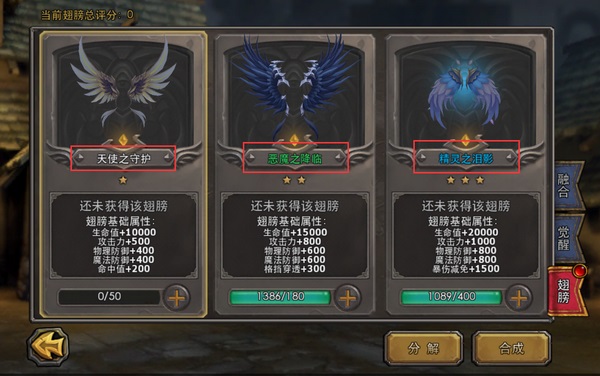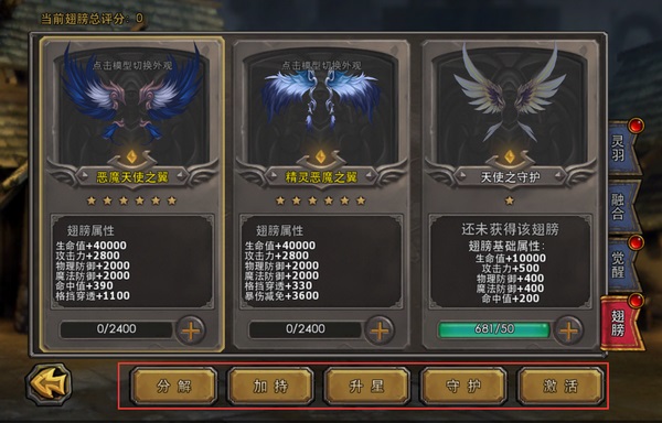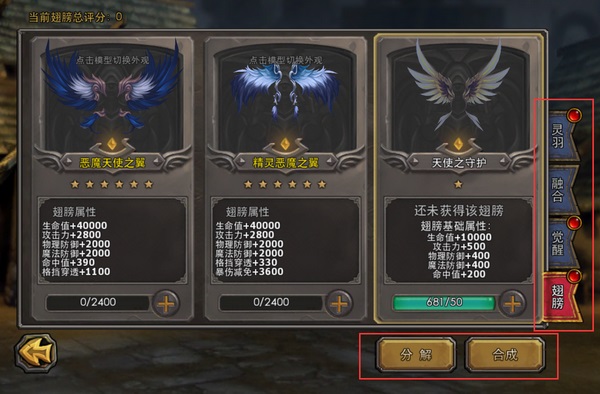 3、未合成的翅膀显示合成选项与分解功能,已激活的羽翼则开放升星、守护及属性加持等进阶操作。