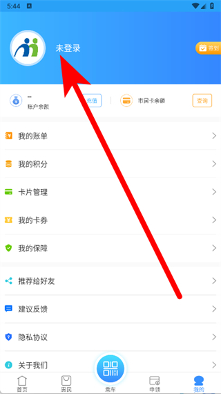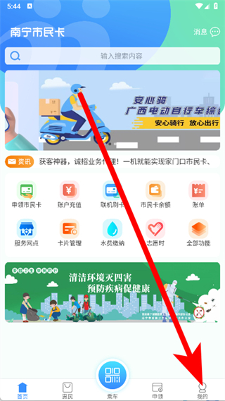 1、打开南宁市民卡,点击底部导航栏最右侧的我的,进入个人中心页面。
