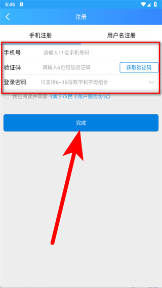 4、输入11位手机号码,点击获取验证码,点击完成按钮,完成账号注册。