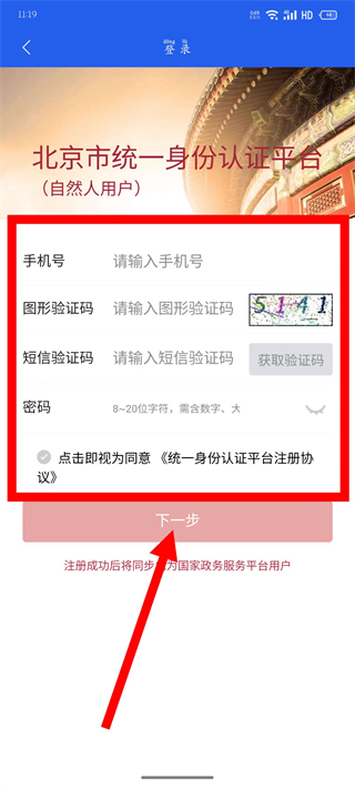 4、填写手机号、图形验证码,获取并输入短信验证码,勾选协议后,点击下一步,完成注册。