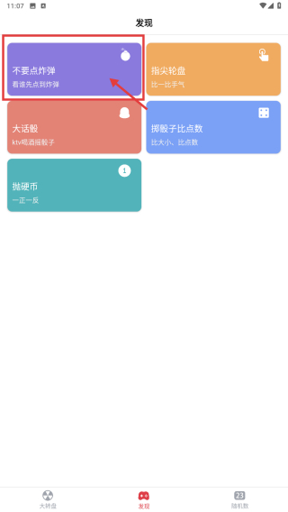 2、在发现功能页面,选择不要点炸弹游戏,进入游戏设置界面。