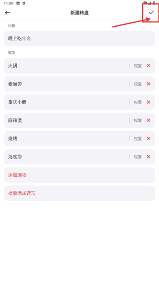 4、在模板设置界面,设置转盘选项如火锅、麦当劳等后,点击右上角确认图标,完成转盘创建操作。