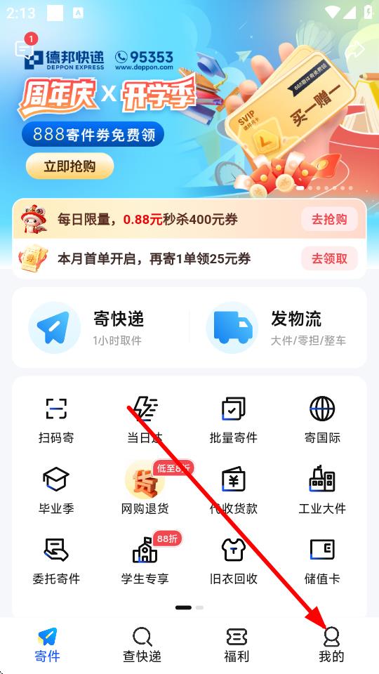1、打开德邦快递APP,进入首页后点击底部导航栏中我的选项。