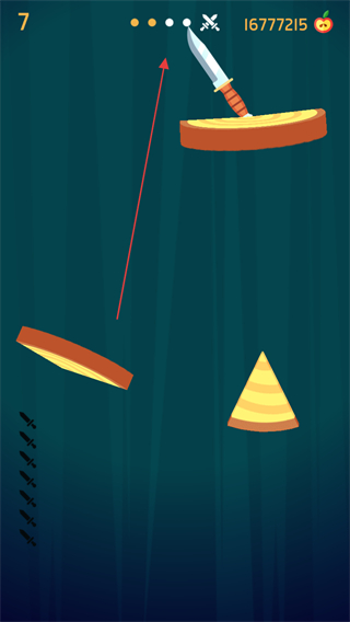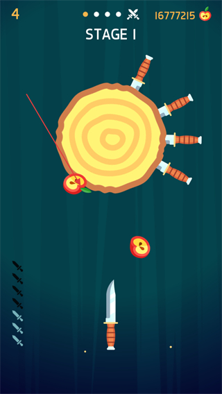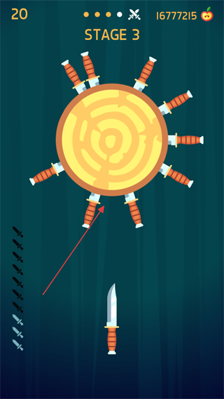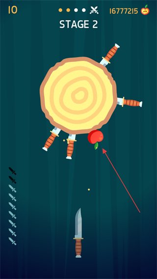 1、STAGE1开始,瞄准旋转木盘,找准空隙发射飞刀插入木盘。