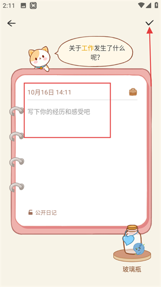 3、在经历和感受填写页面,写下经历和感受后,点击右上角对勾,进入心情封装页面。