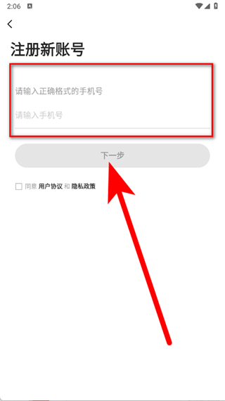 4、在注册新账号页面,输入正确格式的手机号,勾选后,点击下一步,完成注册。
