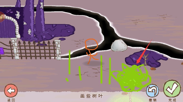 2.向右方向前进,避免靠近蓝紫色的岩浆,到达如图所示的位置后,用下方的树叶画笔在三个干枯的树枝上画树叶即可通过岩浆。