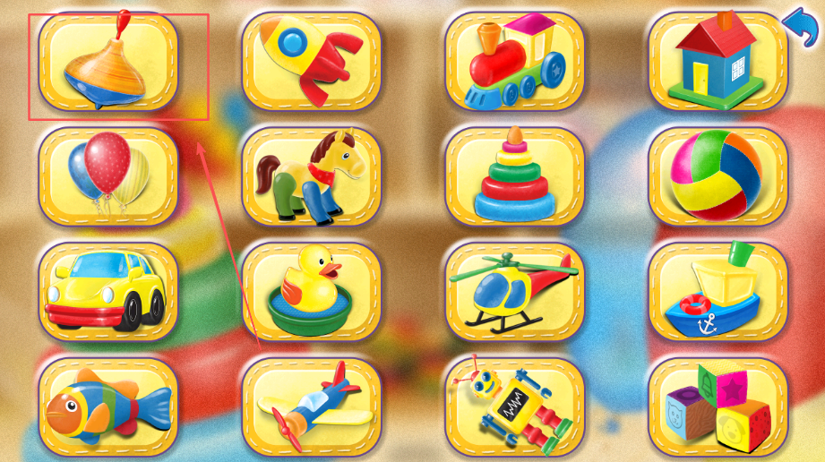 1、初次进入游戏时,小朋友可以从主界面选择自己感兴趣的玩具类型。