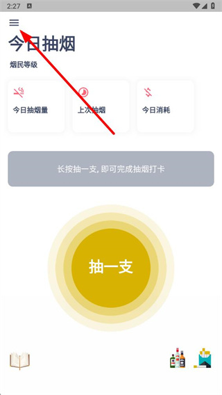 1、打开今日抽烟app,点击左上角的三条横线图标。