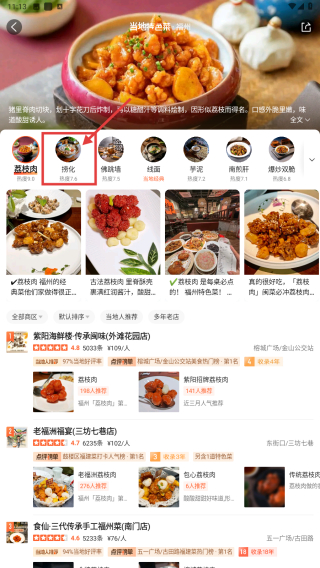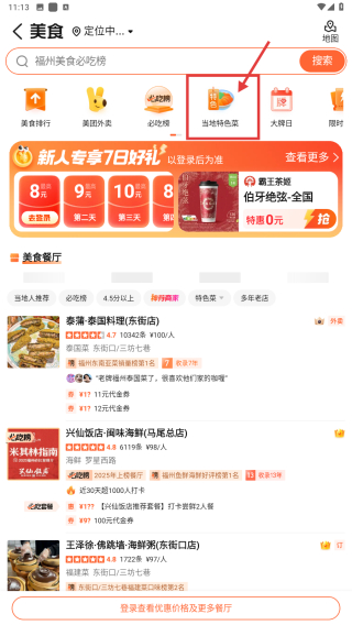 2、在美食频道页面,选择当地特色板块,浏览本地特色美食分类。