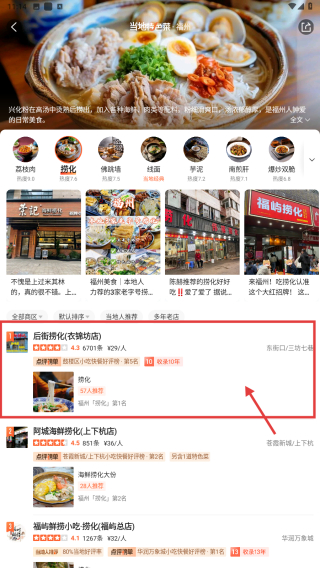 4、在商家列表页,可查看具体美食商家如后街锅边铁塔店及详情,了解本地特色美食信息。