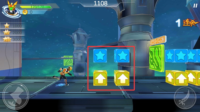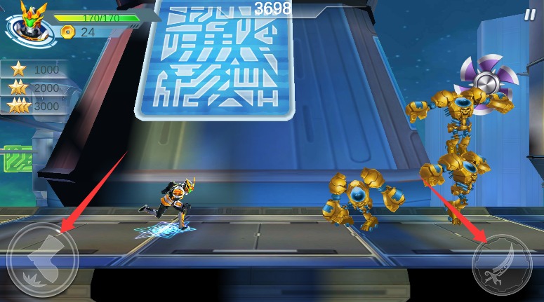2、通过左侧跳跃键灵活躲避障碍与攻击,右侧攻击键发动火焰元素必杀技能。