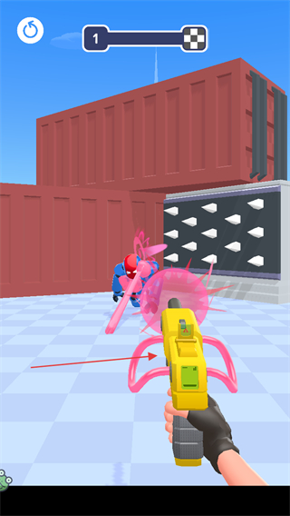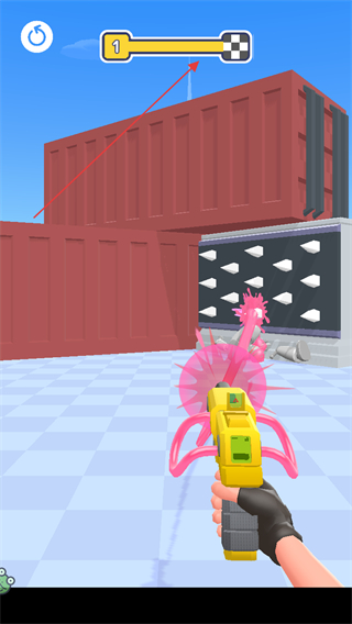 1、进入游戏关卡,滑动屏幕调整视角,瞄准前方橡皮敌人,点击射击按钮攻击。