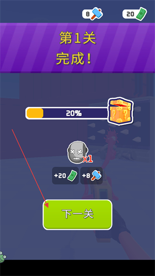 4、当进度条完成,显示第1关完成后,点击下一关按钮,进入新关卡。