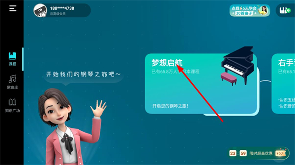 1、在钢琴学习APP课程页面,点击梦想启航课程卡片,进入课程详情页面。